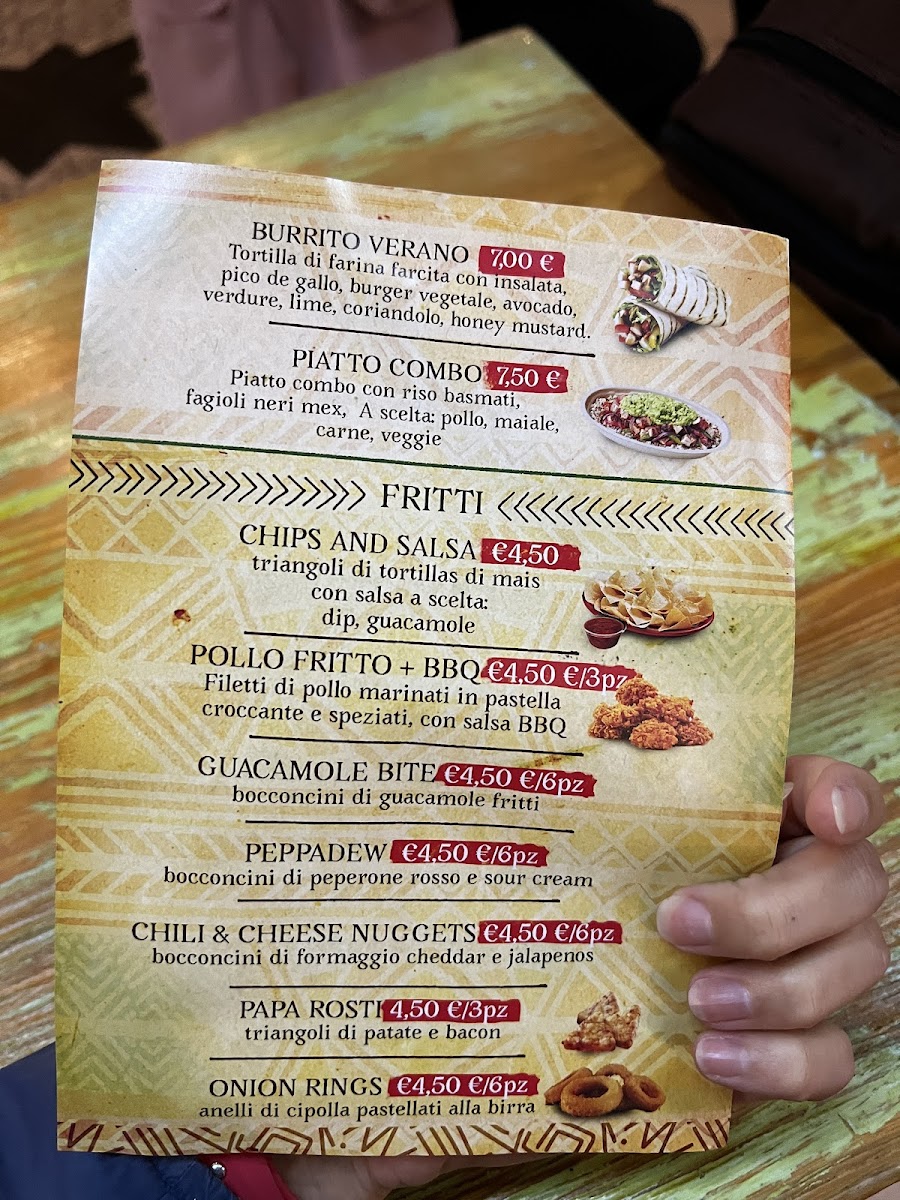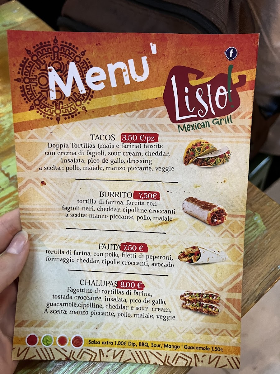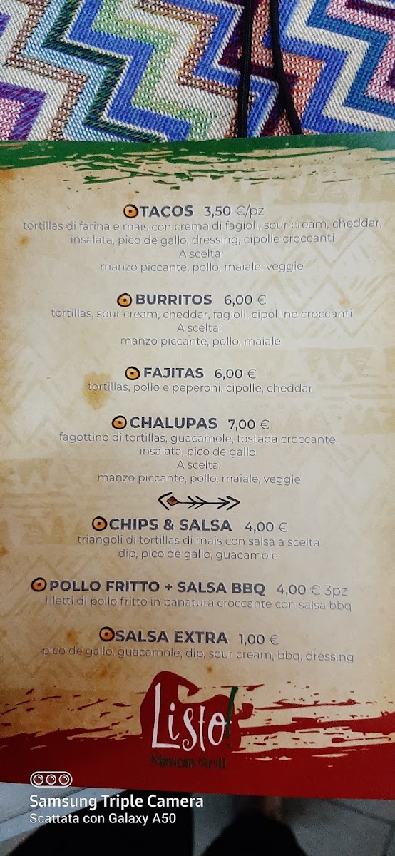 The menu at Listo! Mexican Grill offers a delightful array of traditional Mexican dishes with a fresh twist. One standout is the Jarritos, a popular Mexican soft drink that pairs perfectly with the rich flavors of the dishes. The Chalupas Di Maiale are a must-try, with their crispy base topped with succulent pork, offering a satisfying crunch with every bite. For a lighter snack, the Chips & Salsa are a crowd favorite, delivering the perfect balance of tangy salsa and crispy chips. Those looking for a hearty dish will enjoy the Pollo Fritto Salsa BBQ, where the crispy fried chicken is complemented by a smoky BBQ sauce that elevates its flavor. The Burrito Di Pollo is another excellent choice, with tender chicken wrapped in a soft tortilla and packed with delicious fillings. For a burst of vibrant summer flavors, the Burrito Verano is a refreshing option, combining fresh ingredients that make it the perfect dish to enjoy during warm days. Overall, Listo! Mexican Grill offers a flavorful and satisfying menu that captures the essence of Mexican cuisine in a charming Italian setting.